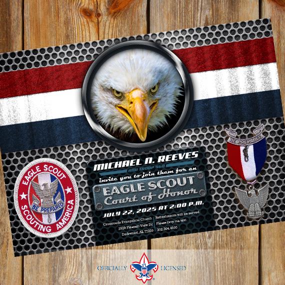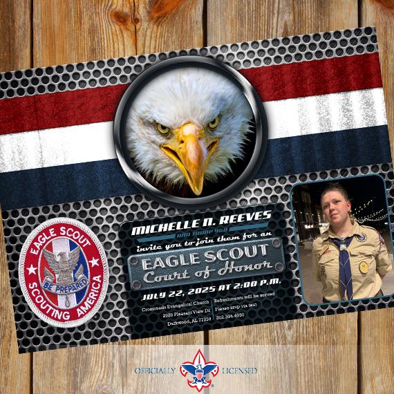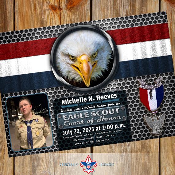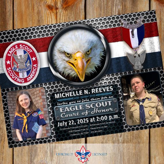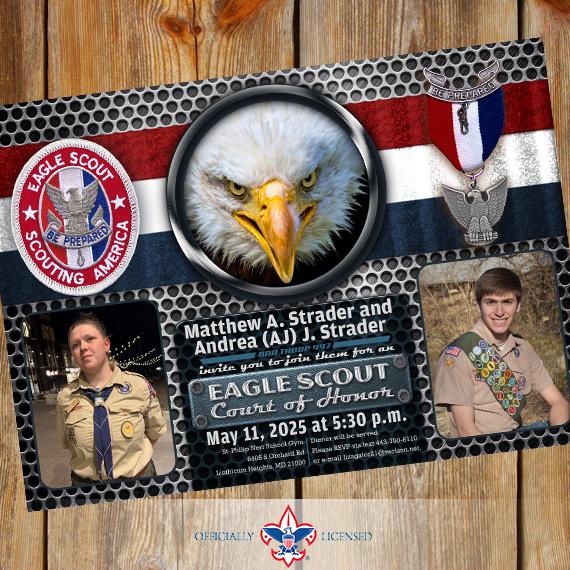 Invite your friends and family to your celebration online or in person with this distinguished 5"×7" Eagle Scout Court of Honor invitation. This invitation is designed to include two photos (aren't cub scouts cute?!) but can be designed with a single photo or no photos at all!