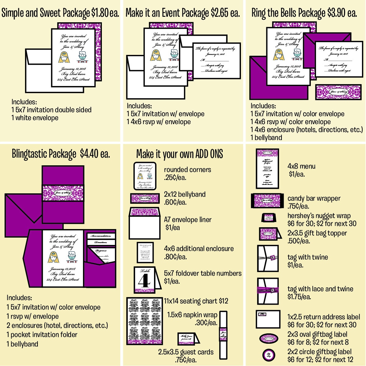 The digital file is $22. Printed invitations and packages are shown in the photos above. We can customize your order any way you'd like, please convo with questions.