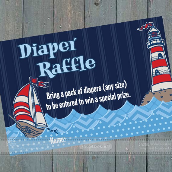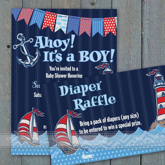 This navy baby shower invitation, and coordinating diaper raffle card, with it's striped background and coastal icons is a perfect way to celebrate and welcome the new bundle of joy!