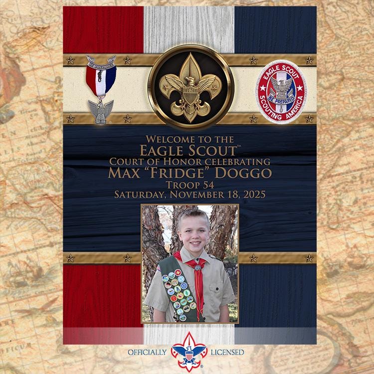This welcome poster adds beautifully to the Court of Honor, measures 18"x24", and is printed on 80 lb glossy paper. After the court of honor, it is a lovely remembrance featuring your Eagle Scout's photo. It coordinates with your other designs (check out the shop to see them all!) and invites your guests with style!