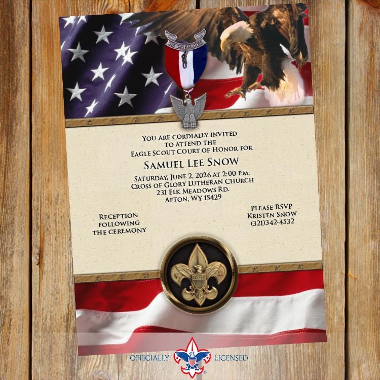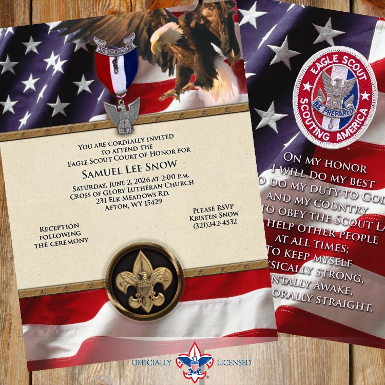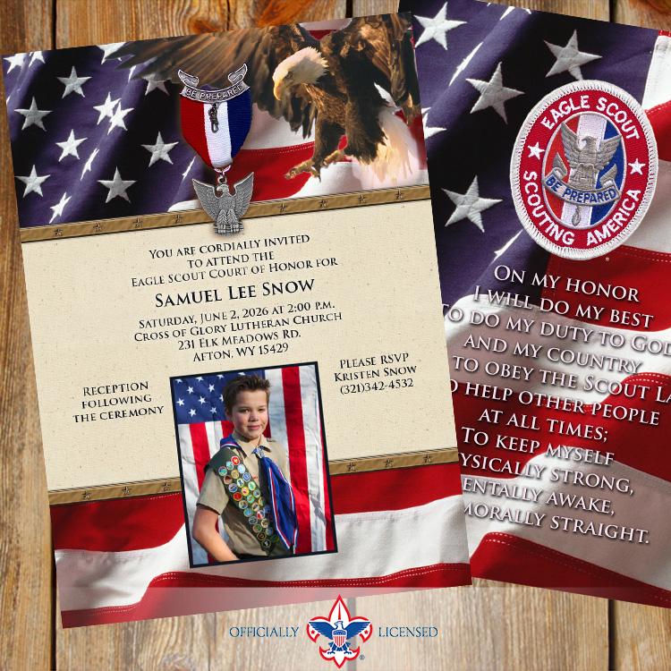 Invite your friends and family to your celebration online or in person with this distinguished 5"×7" Eagle Scout Court of Honor invitation. This invitation is designed to include two photos (aren't cub scouts cute?!) but can be designed with a single photo or no photos at all!