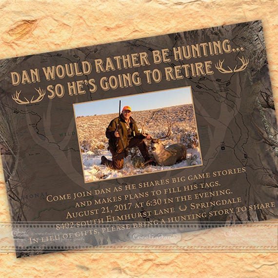 This hunting retirement party invitation (also great as a birthday party invitation) has a camo and map background and unique fonts.