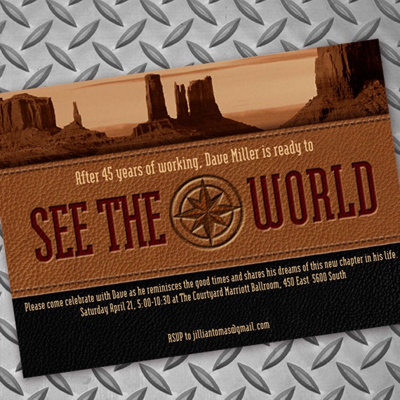 This fun and stylish retirement invitation (also nice as a birthday party invitation) has a textured leather appearance with unique elements.