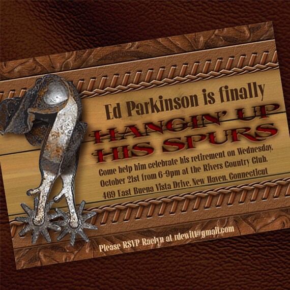 This cowboy retirement invitation (also nice as a birthday party invitation) has a textured leather appearance, vintage spurs, and cowboy text.