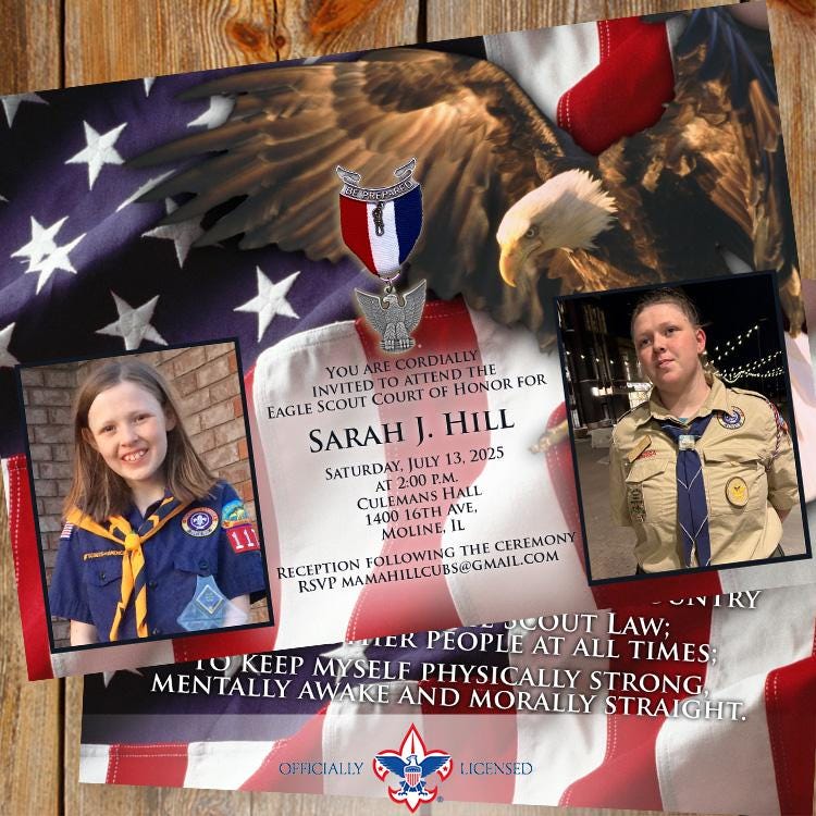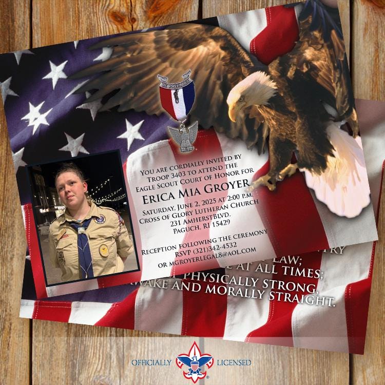 Invite your friends and family to your celebration online or in person with this distinguished 5"×7" Eagle Scout Court of Honor invitation. This invitation is designed to include two photos (aren't cub scouts cute?!) but can be designed with a single photo or no photos at all!